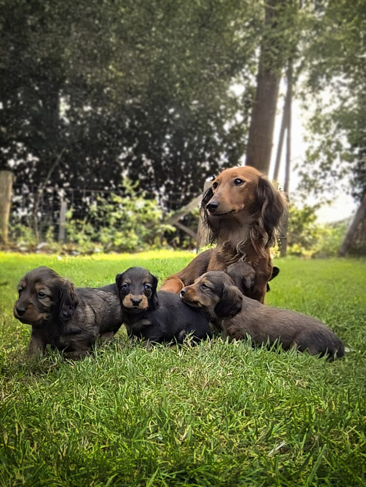 Meine Hündin Clärchen von der Wildwiese hat am 25.08.2025, sechs wunderschöne reinrassige Langhaardackelwelpen, in der Farbe Rot, zur Welt gebracht.…